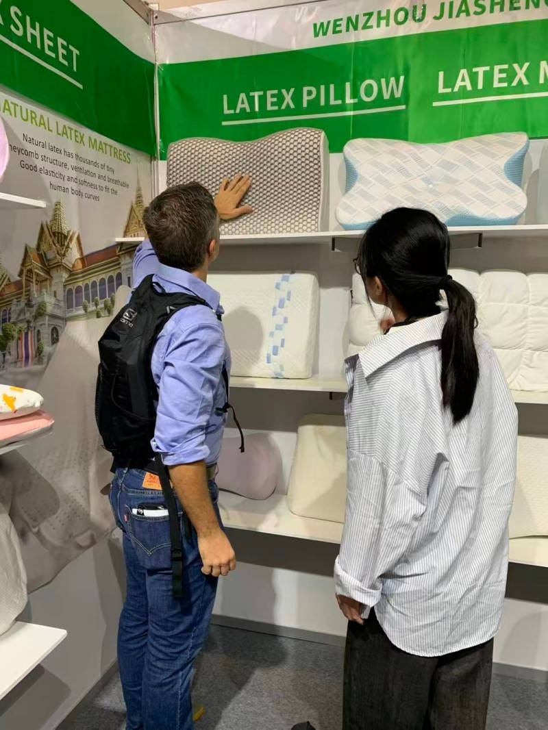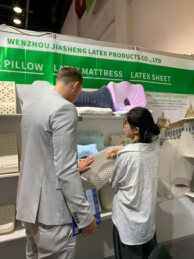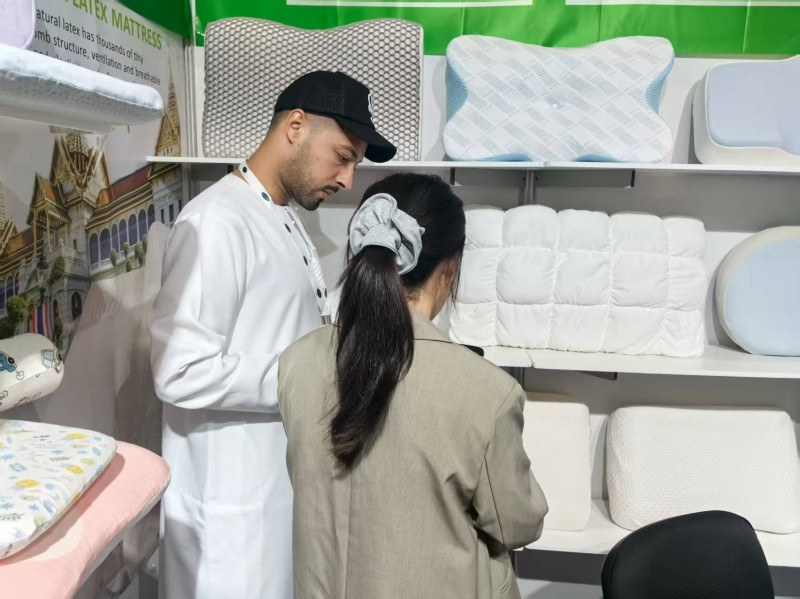 Yn yr Arddangosfa Cwsg Dubai hon, mae'n anrhydedd i ni ddangos ein clustogau sy'n canolbwyntio ar gwsg i ymwelwyr o bob cwr o'r byd. Rydym yn ymroddedig i gyflwyno dau o'r gobenyddion sy'n gwerthu orau ar y farchnad: ygobennydd latecs naturiola'r deunydd smart moderngobennydd ewyn cof. Mae'r adlamiad cyflym a'r priodweddau gwrth-alergedd o latecs yn cael eu ffafrio'n fawr gan selogion latecs. Yn y cyfamser, gall ffit eithaf ewyn cof ddarparu cwsg dwfn. Gwnaeth ein cyfathrebu manwl â chwsmeriaid ar y safle i ni deimlo eu bod yn mynd ar drywydd gobenyddion. Credwn yn gryf mai darparu dewisiadau personol ar gyfer gwahanol arferion cysgu yw'r allwedd i gwsg o safon.